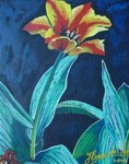 2012Een realistisch potret van een roodgele tulp. Het werk bestaat uit: een al reeds zwart doek,verdikkingsmiddel en acryl. De tulp zelf is dus imasto maar het doek niet.
